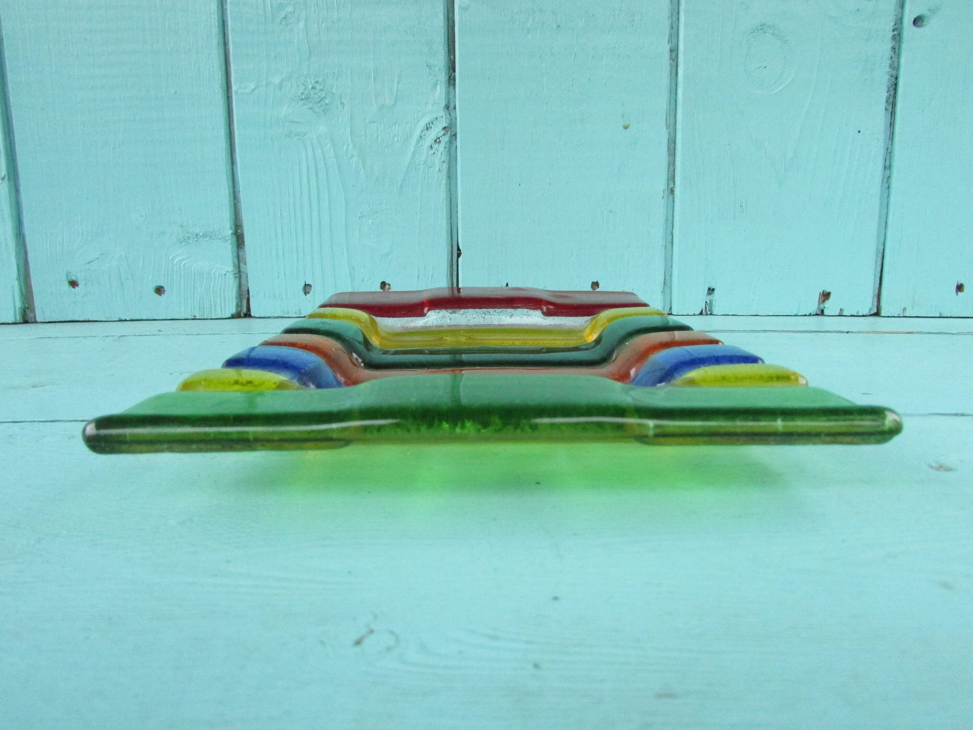 This vintage Murano-style glass dish combines artistry with function, featuring vibrant multicoloured fused glass that instantly brightens any space. Measuring 21cm by 23.5cm and 1.5cm deep, it’s perfect for serving or display, adding a touch of elegance and conversation-worthy charm to your home.