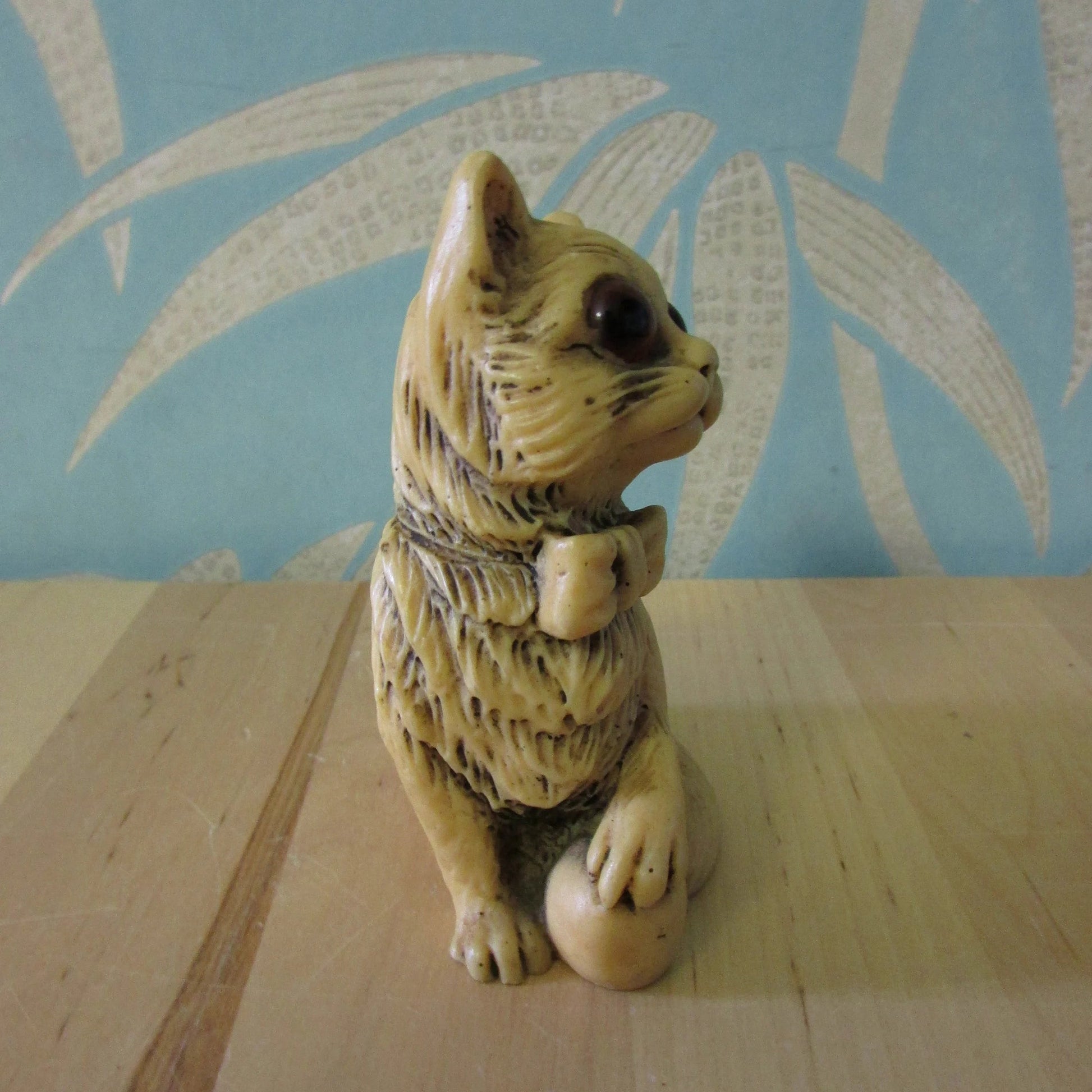 Vintage Norleans ivory resin cat in bow tie figurine with glass eyes