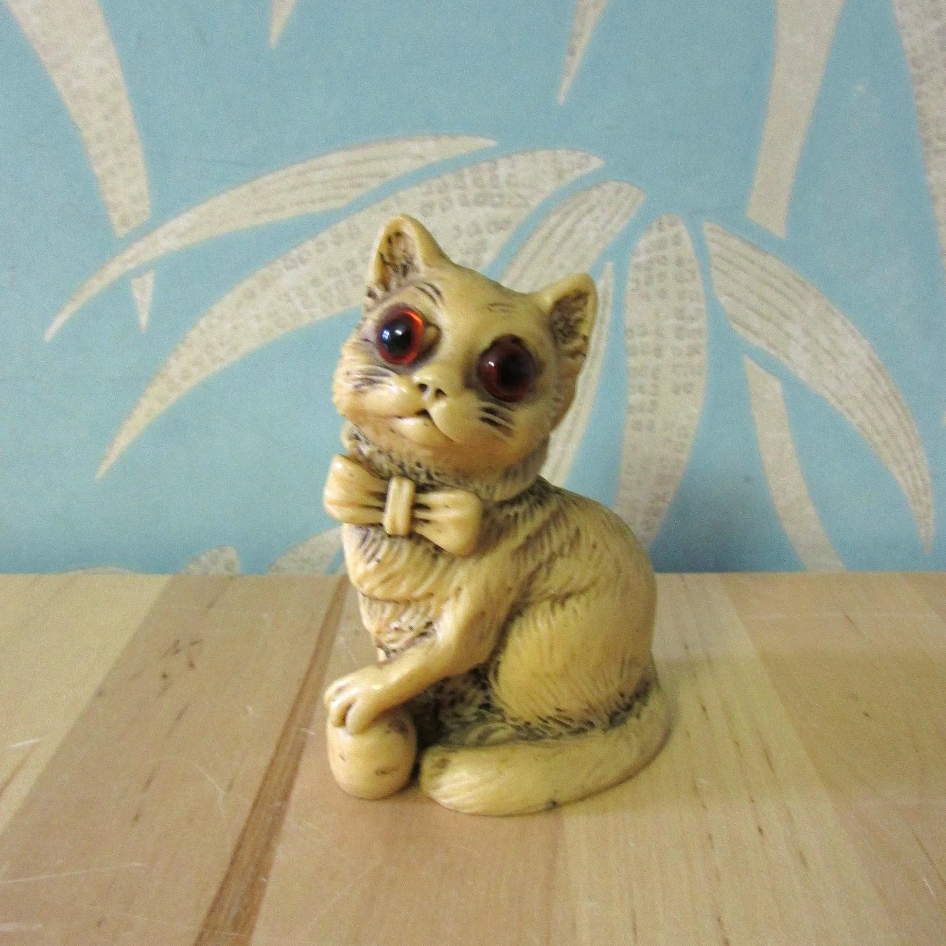 This charming vintage Norleans cat figurine is ready to steal the show! Crafted from ivory resin with an adorable bow tie detail, this little feline stands approximately 9.5cm tall and features striking glass eyes. Perfect for collectors of retro kitsch, this delightful piece brings a touch of mid-century charm and personality to shelves, desks, or display cabinets. A purr-fect addition to any collection!