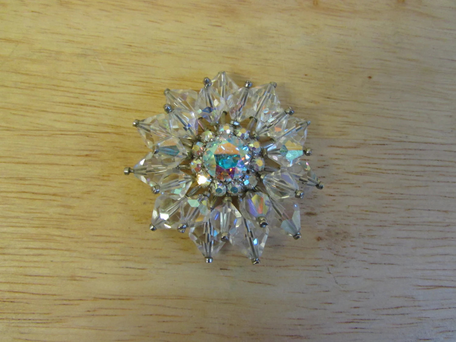 This vintage pavé crystal glass flower brooch, measuring approximately 5cm in diameter, adds timeless elegance to any outfit. Its sparkling crystals catch the light beautifully, creating a standout accessory that enhances your style with a touch of classic charm. Perfect for special occasions or elevating everyday looks, this brooch is a delicate statement piece that complements your wardrobe effortlessly.