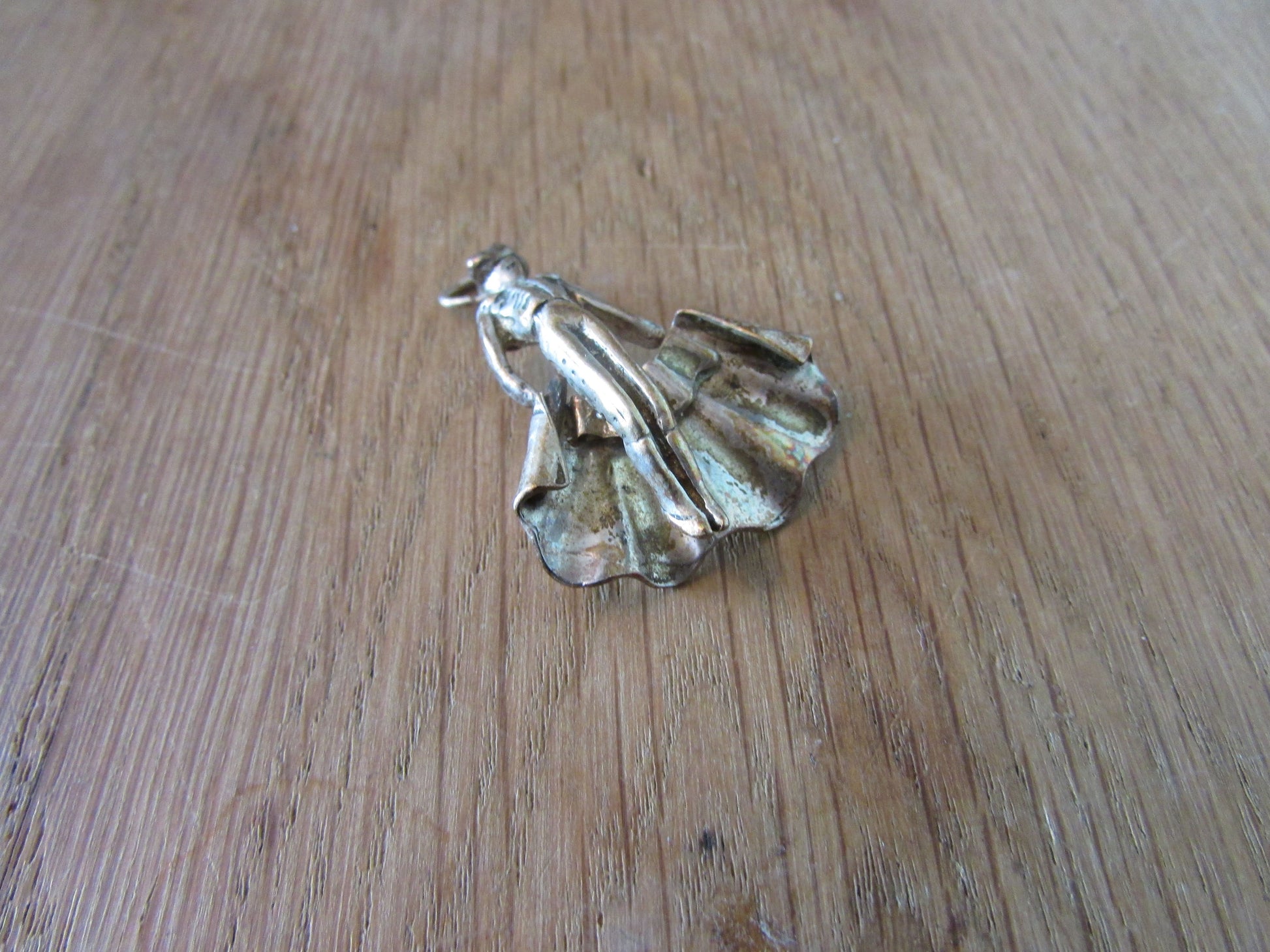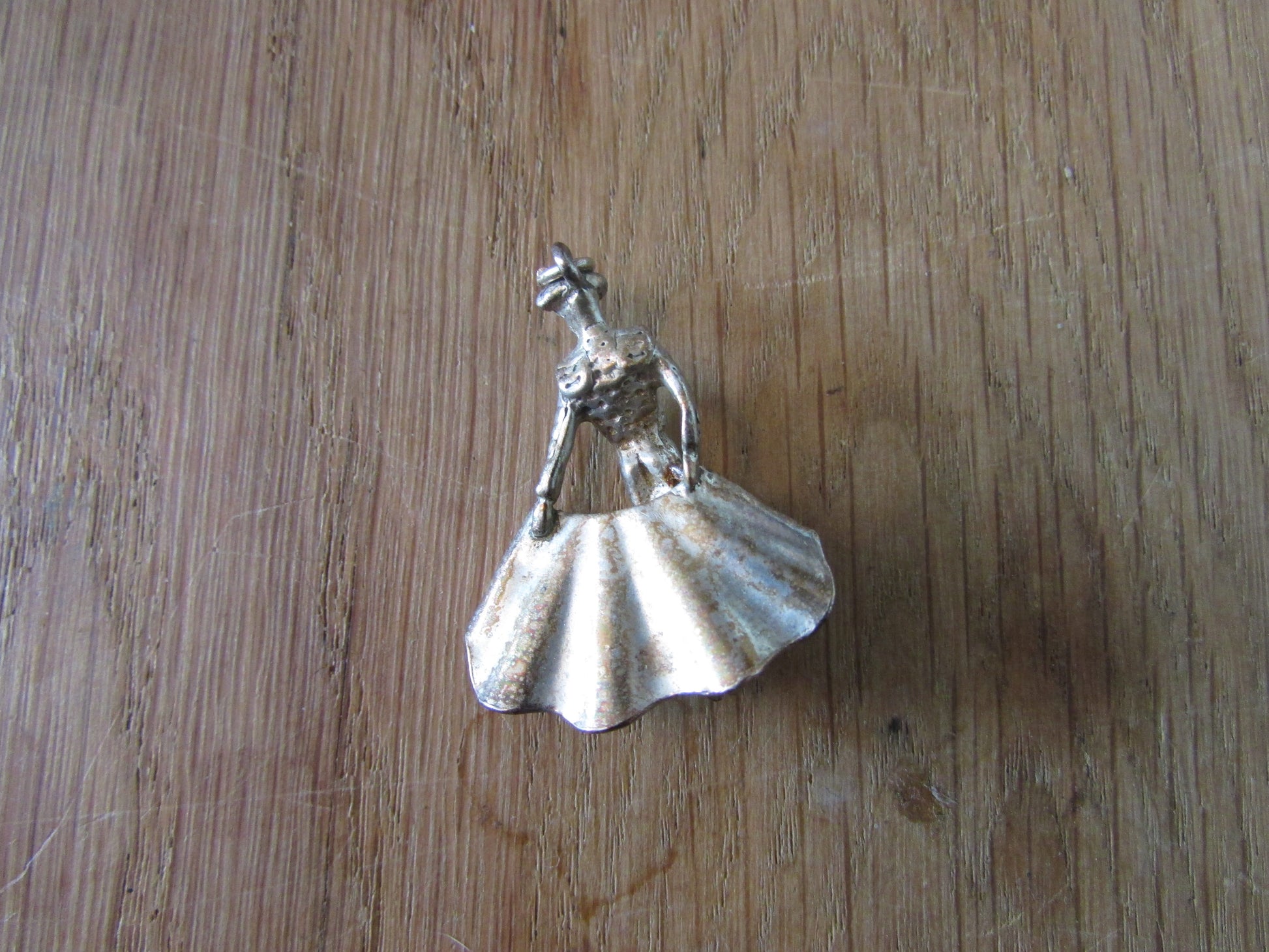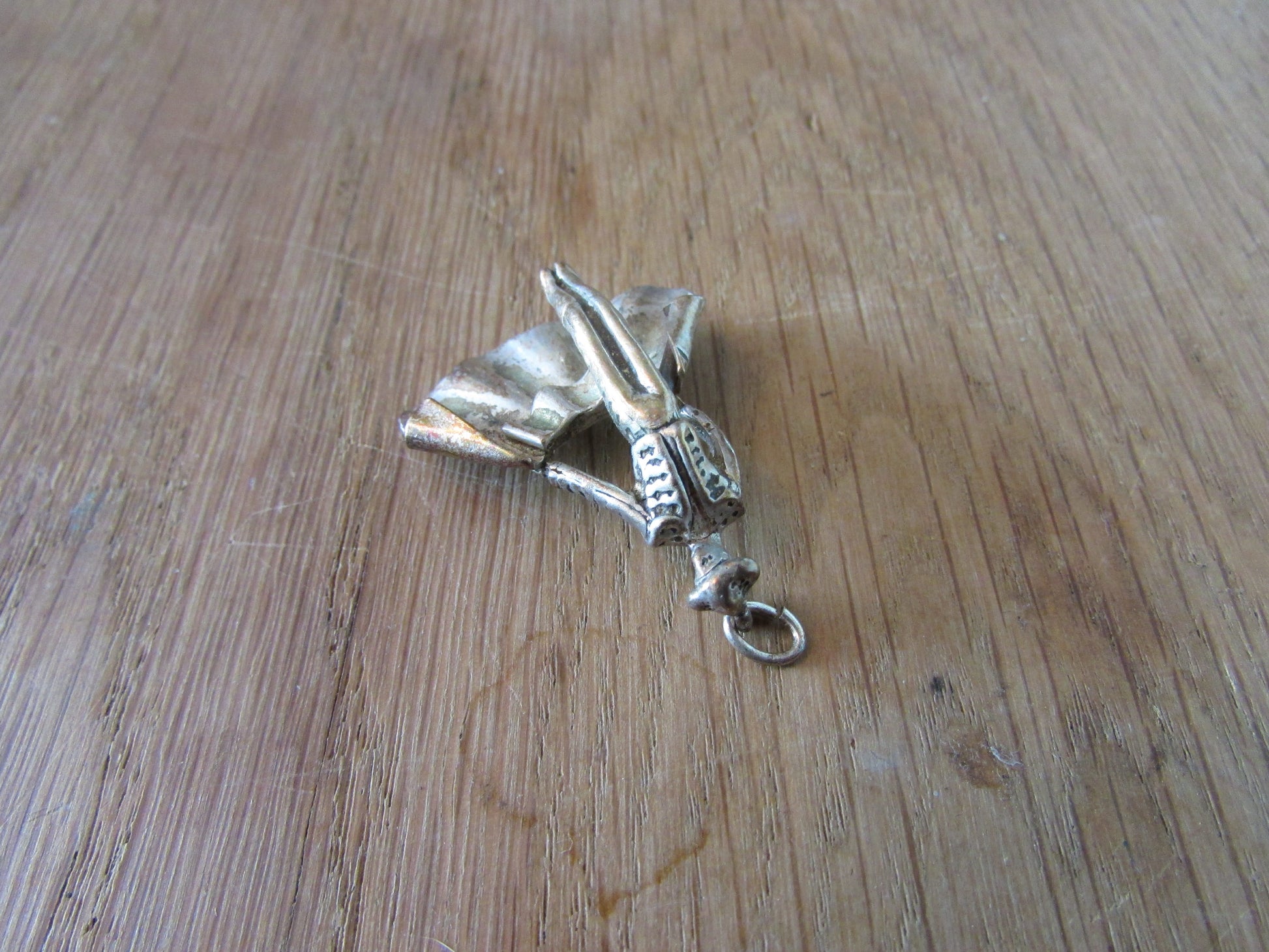 This vintage silver-tone matador charm measures approximately 3cm tall and 2.5cm wide, making it a delicate yet striking accessory. Its detailed design captures timeless elegance, perfect for adding a unique touch to your bracelet or necklace. A charming piece that effortlessly blends classic style with a hint of bold character.