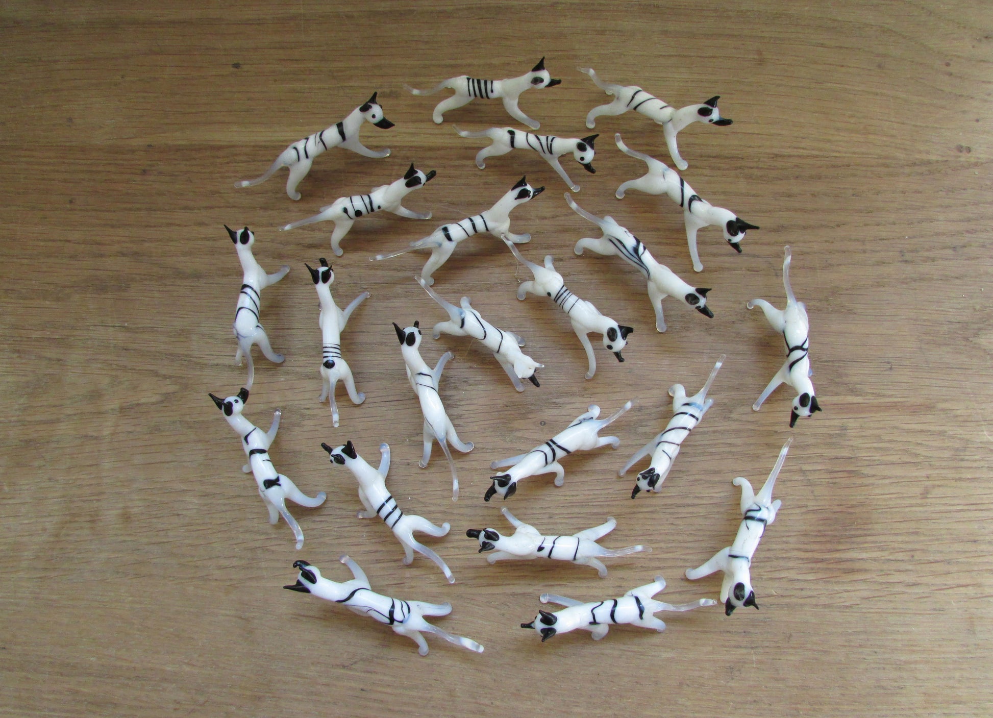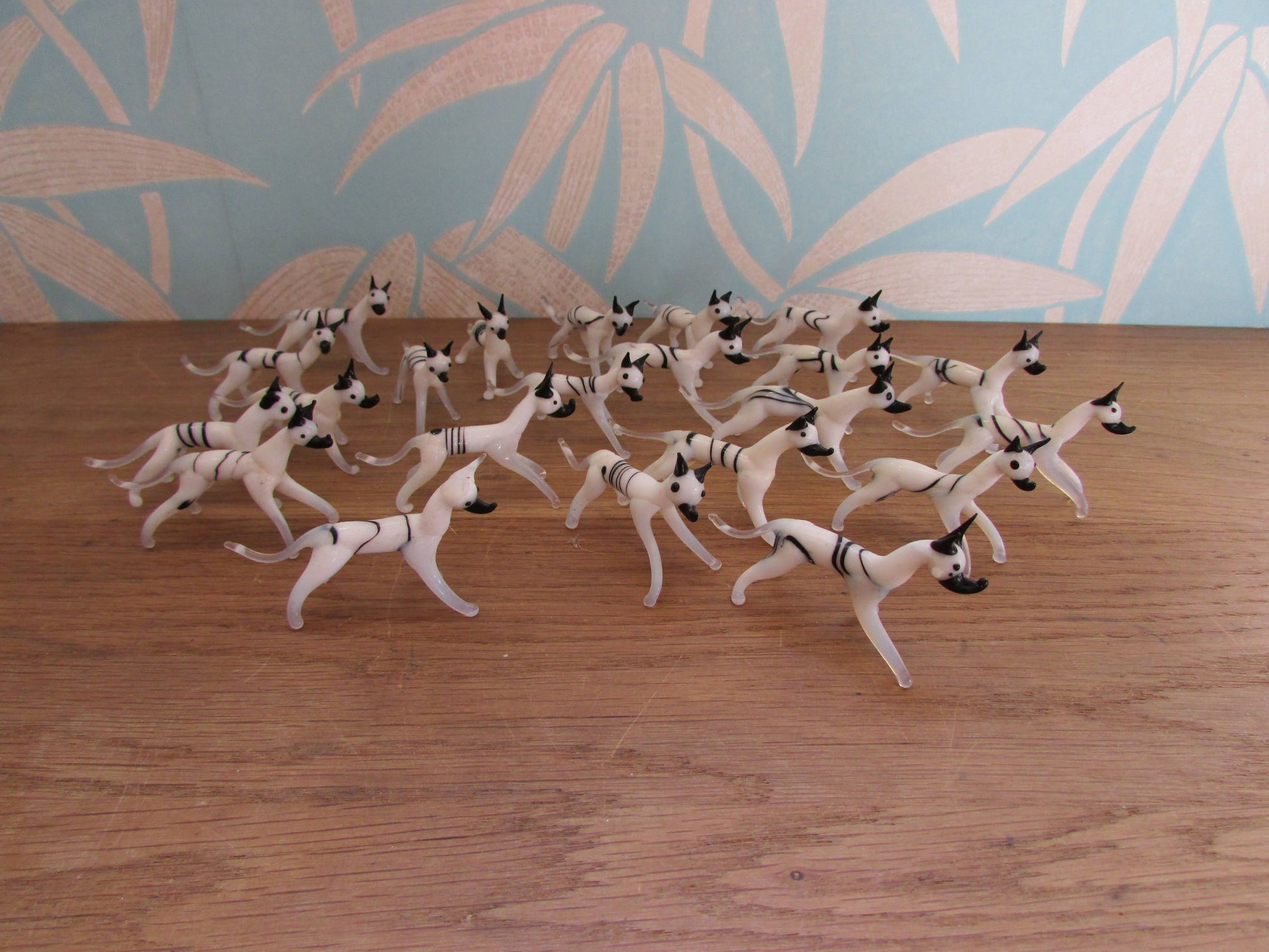 These charming vintage blown glass black and white hound figurines make a delightful addition to any collection. Measuring between 7cm and 8cm, the delicate craftsmanship captures the essence of these lovable critters, making each figurine a special treasure to cherish or gift. Add a touch of timeless charm with one of these captivating glass hounds today. As there as so many of these lovely critters, they will be picked at random when ordered - note they do vary slightly in size and pattern.