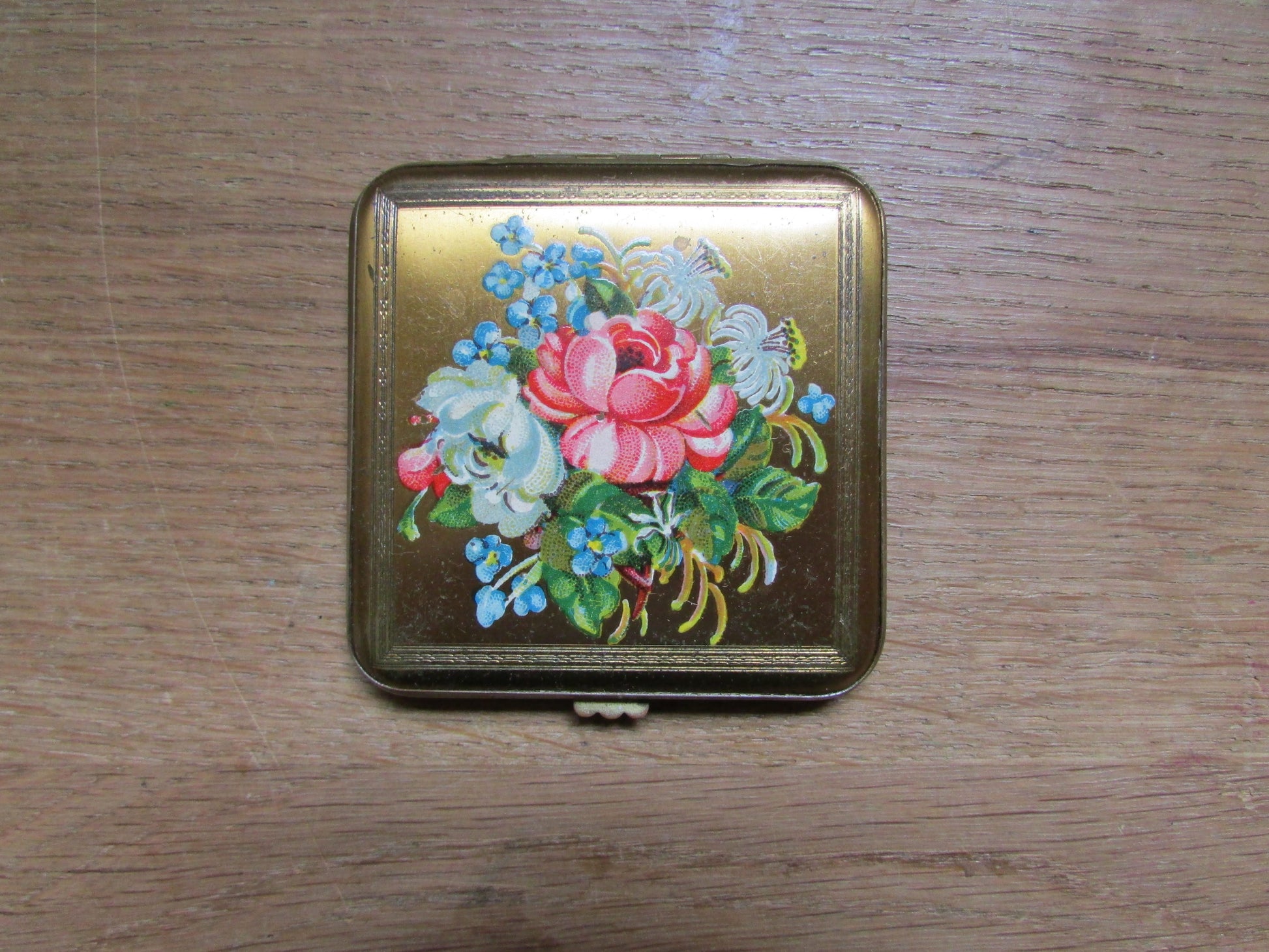 This vintage Glenda compact from Britain showcases a gold-tone square design measuring around 7cm², adorned with beautifully hand-painted flowers. Its elegant, classic shape adds a touch of sophistication, making it a perfect highlight for any vintage makeup collection or collectible display.